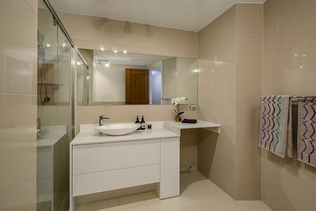 The bathroom is exquisitely presented, with quality floor to ceiling tiles, linen cupboard, and large shower alcove.